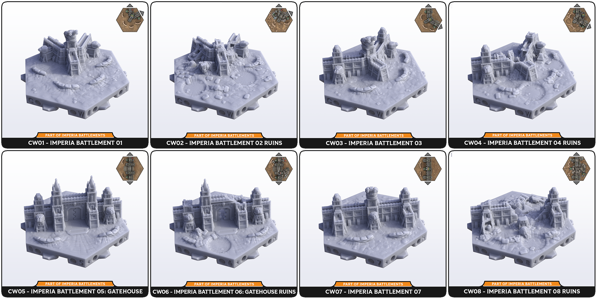 The Battlement stretch goals (£65K and £75K) are complete and the Imperia Battlements set is now available now in our store and to all Dominion backers and above. The set consists of 8 unique wall sections and 8 ruined variants.